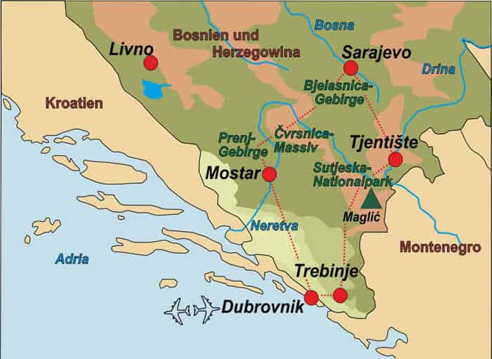 Im Osten von Europa, zwischen Kroatien, Montenego und Serbien liegt, im Herz des Balkan, Bosnien und Herzegowina. Bisher gehört Bosnien zu den eher unbekannten Urlaubszielen, jedoch ist das Land ein echter Reise-Geheimtipp! Es erwarten Sie traumhafte Naturlandschaften, gastfreundlichen Menschen, Ursprünglichkeit und viele erlebnisreiche Wandertouren weit abseits des Massentourismus.