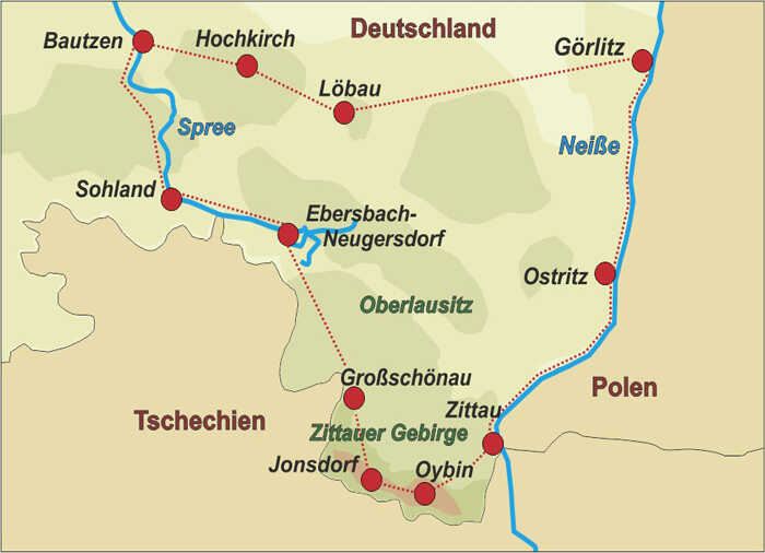 Unterwegs erfahren Sie viel Wissenswertes über die Region im Dreiländereck Deutschland-Polen-Tschechien, die auf eine bewegte Geschichte zurückblickt. Die Fahrradetappen ohne Gepäck führen Sie auf ausgesuchten Wegen, vorwiegend über Nebenstraßen und über Wald- und Feldwege – so können Sie die abwechslungsreiche Naturlandschaft zwischen dem Naturpark Zittauer Gebirge im Süden, dem Tal der Neiße im Osten, der Tausendjährigen Stadt Bautzen im Norden und entlang der Spree im Westen, an der Grenze zu Tschechien genießen.